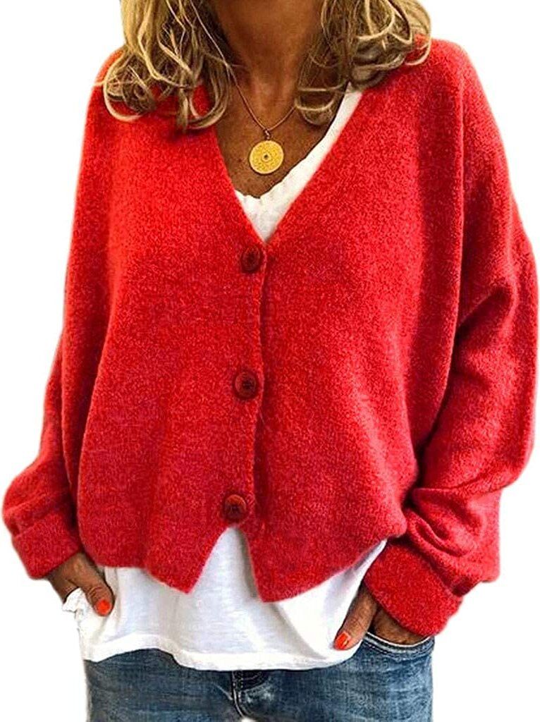 ASKSA Damen Strickpulli Lose Lässige Strickjacken V Ausschnitt Einfarbig Knopf Strickjacke Pullover, Rot, S