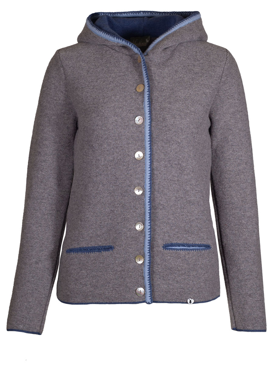 Huber Kapuzen Strickjacke Erika, grau, Einfassung in Hellblau Blau