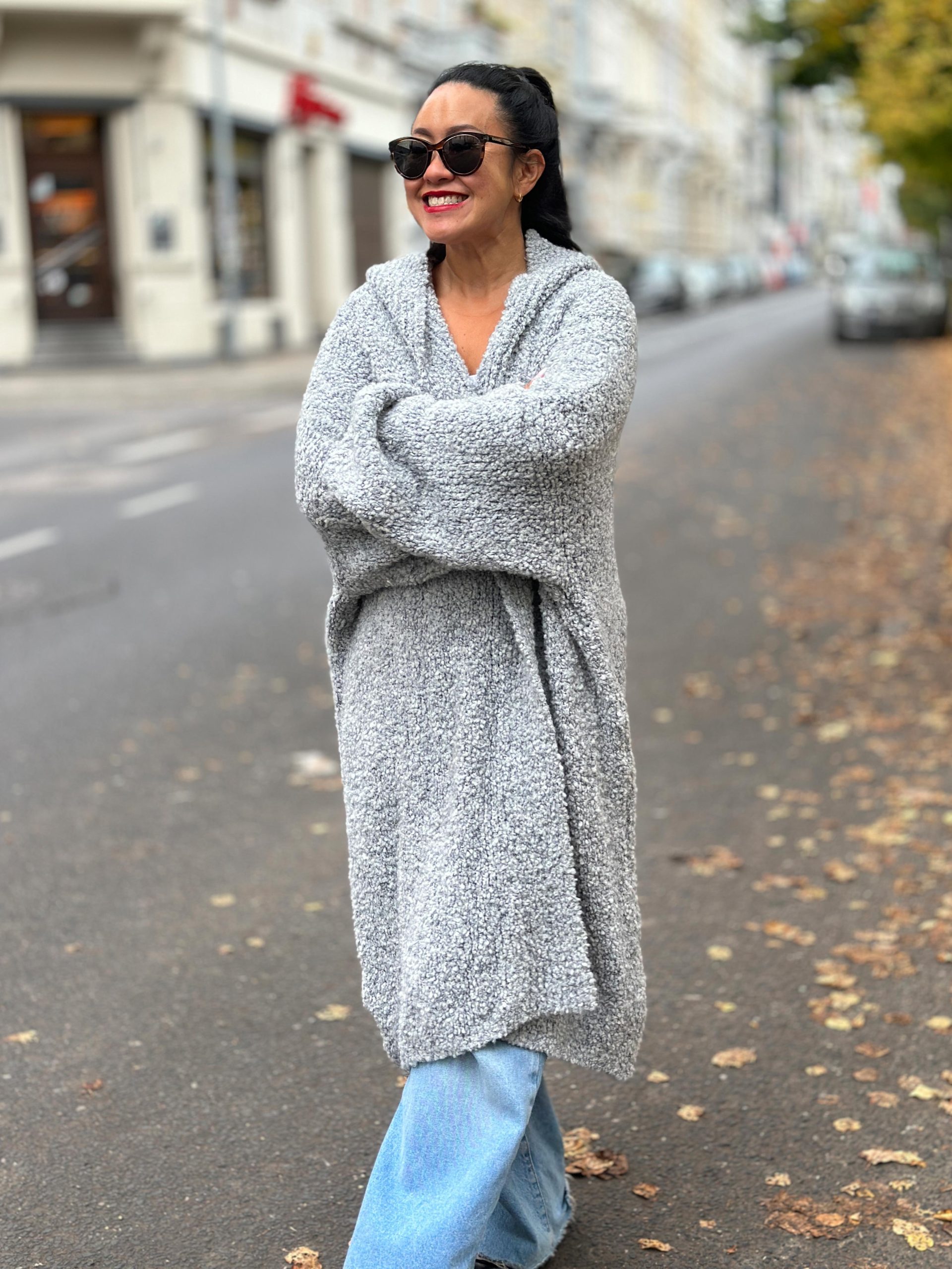 PREMIUM Bouclé Strickjacke mit Kapuze Hellgrau